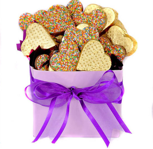 Happy Heart Milk Chocolate. Embossed in gold foil five times. a box of Romeo Milk Chocolate Hearts A Lilac Gift Box is included. Wrapped with a Gift Card and a Ribbon. Exquisitely satisfying! Click here to purchase the hamper.